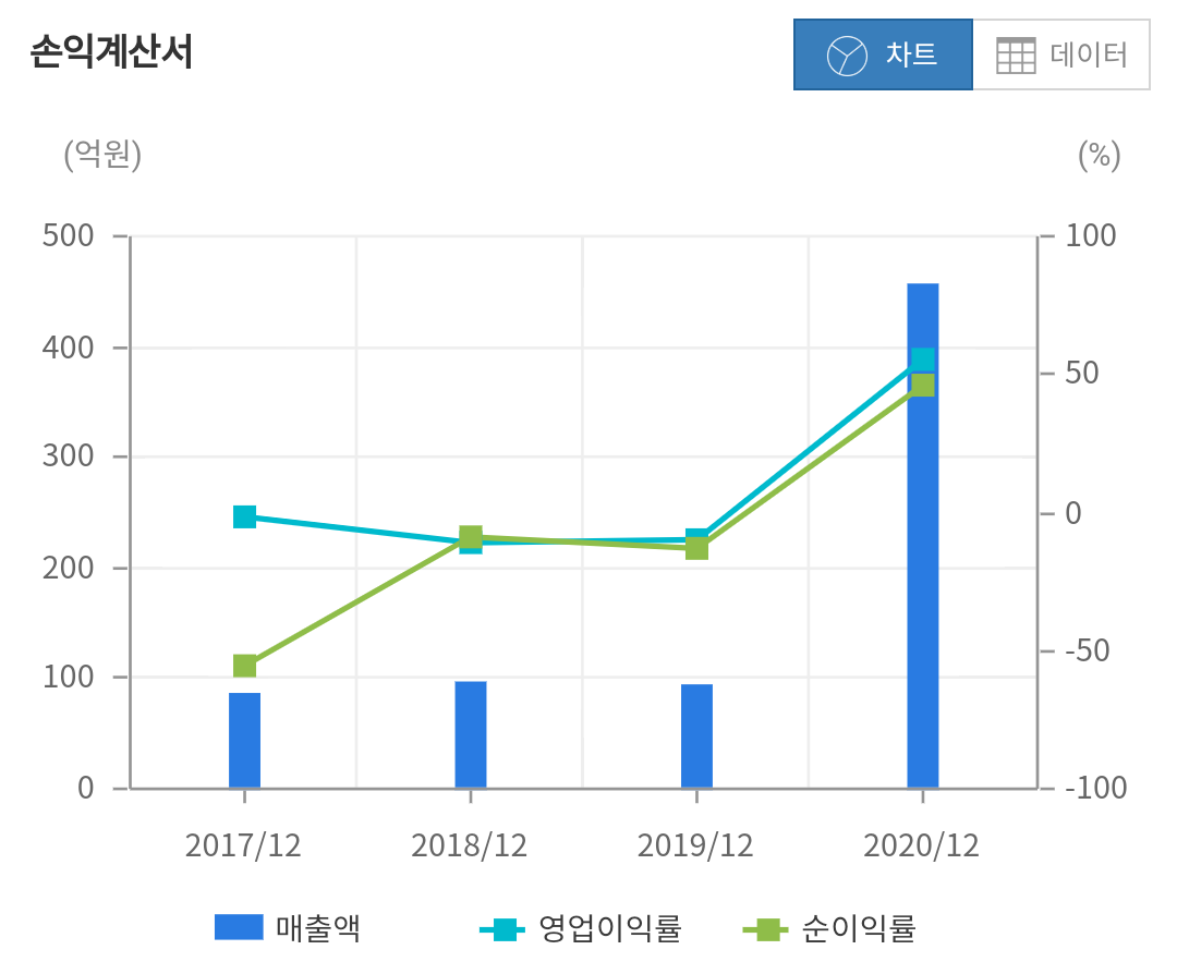 매출은 2018년 97억 2019년 92억 2020년 457억원으로 코로나로 인하여 2020년에 큰 폭으로 증가하는 모습을 보였습니다. 영업이익 또한 2018년 –10억 2019년 –9억원에서 2020년 254억원으로 흑자 전환하게 되었습니다.